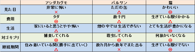 前に猫を飼いだしてから一切でなくなった事があったので(何があったかは想像したくないくただ単に綺麗にいなくなったと思いたいが)見た目が怖いアシダカグモよりも猫の方が(理由は不明だが)ゴキブリが出なくなると思う。